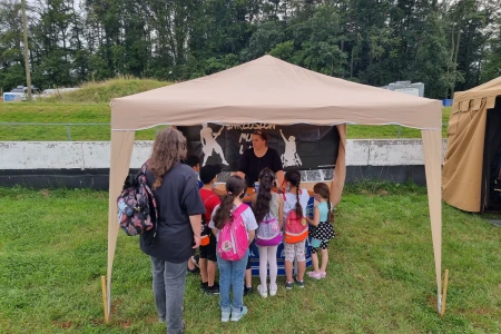 Der Stand auf dem Mittelalterfest in Osnabrück, mit einer Gruppe Kinder davor.Eine dieser Straßenbegegnungen ist James oder viel mehr der Assistent von James und auch das Wort Straße, darf man hier wohl nicht zu wörtlich nehmen.