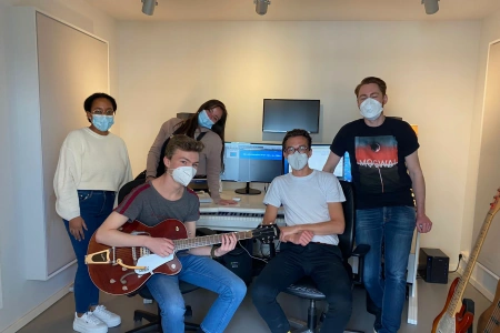 James spielt Gitarre zusammen mit seinem Team von BLUTAnfang des Jahres 2022 kam dann endlich die erlösende Nachricht, dass Kultur wieder stattfinden darf und auch einen neuen Anlauf nahmen wir gemeinsam in Sachen Praktikum für James. Es war sehr kurzfristig und teilweise sehr mühsam, aber letztendlich besuchte James das Team von BLUT in Hamburg, zu seinem Praktikumstag. Gemeinsam spielten sie Instrumente ein und zeigten dem Schüler, wie diese abgemischt werden.