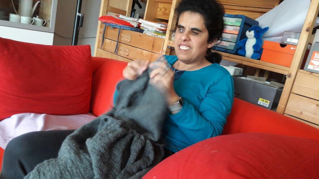 Lydia sitzt auf dem Sofa und strickt. Kein großes Ding als BlindeEs dauert nicht lang, bis sich eine ältere Frau darüber wundert, dass ich trotz kranker Augen stricken kann. Für sie ist das absolut unfassbar. Erst recht, da ich ein großes Strickstück in Form eines Rocks in Händen halte und in schnellem Tempo stricke.