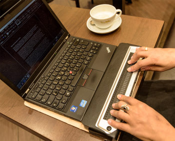 Auf dem Bild sieht man einen Laptop mit Braillezeile für bline NutzerInnen. Auf dem Bildschirm sind die ersten Zeilen eines Textes zu sehen. Neben dem Rechner steht eine Tasse KaffeeWir können nicht darauf warten, dass nicht Blinde zu unseren Veranstaltungen kommen und sich freiwillig informieren. Damit erreichen wir nur eine verschwindend kleine Anzahl. Wenn wir aber dorthin gehen, wo sich unsere Zielgruppe aufhält, nämlich überall da wo Menschen eben sind, dann können wir mehr erreichen.