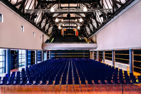 Bei Veranstaltungen mit nummerierten Plätzen nehmen wir für den Rollifahrer einen Stuhl heraus. Im Saal im Kulturhaus Laupheim finden bis zu 700 Besucher Platz.