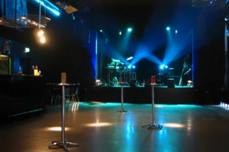 Per Lift gelangt man ganz bequem in die erste Etage. Der Saal ist ebenerdig. Ein Rohstuhlpodest vor der Bühne gibt’s nicht.