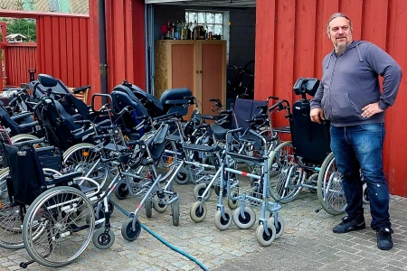 So bekam ich aus meinem Netzwerk ein Angebot für Hilfsmittel. Simone stellte über ihren Arbeitgeber, das Haus Landblick, einem Heim für Senioren im Norden – zwei große Ladungen an Rollis, Rollatoren und Pflegerollstühle zur Verfügung. Zusammen mit einem BUDDIE von Inklusion Muss Laut Sein holten wir diese ab und brachten sie in eine von meiner Vermieterin kostenfrei bereitgestellten Halle.